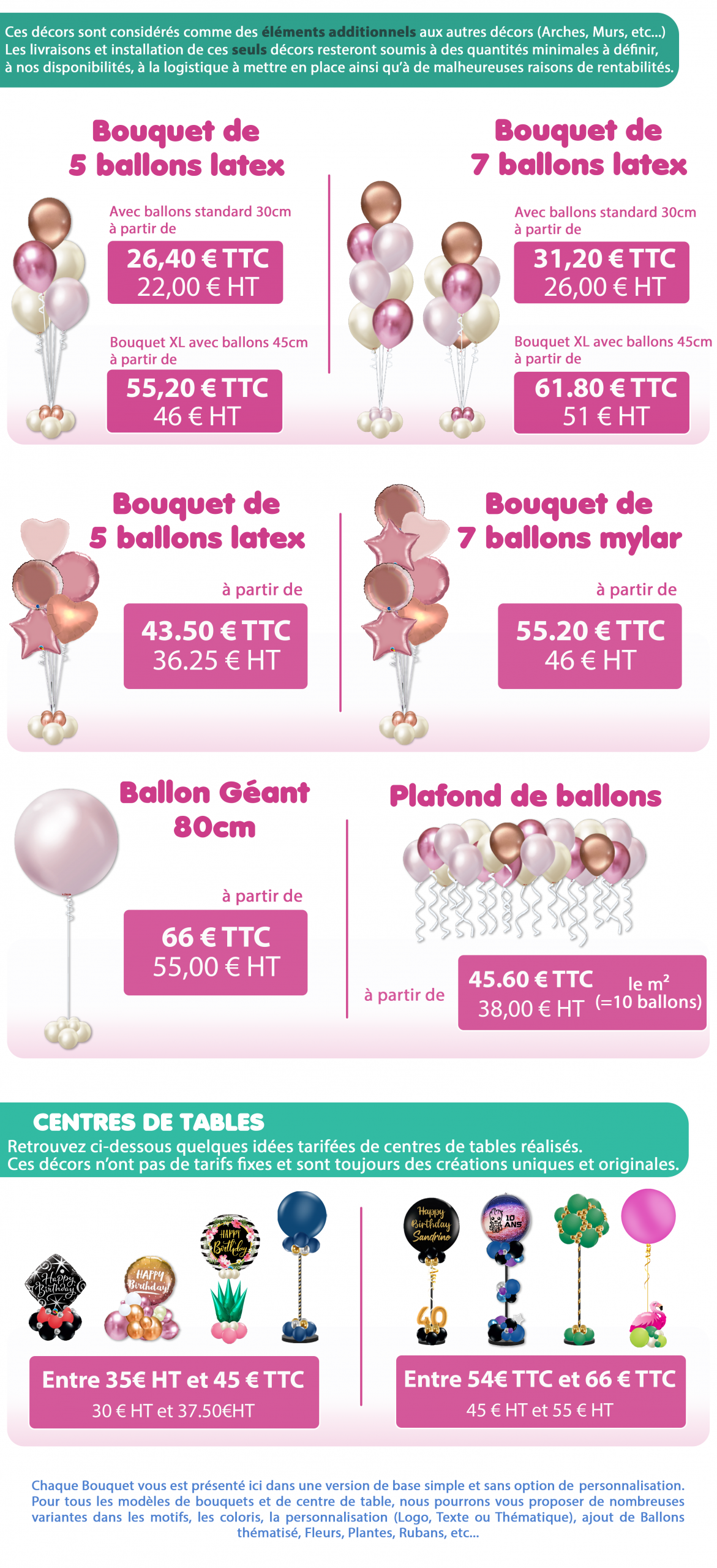 TARIFS DES BOUQUETS (intérieur uniquement) ET CENTRES DE TABLE Pour décorer vos tables, vos salles de réception, un buffet... Thèmes et Personnalisation Un grand choix de ballons permet de nous adapter à chacune de vos thématiques. Nous pouvons également personnaliser les ballons avec un texte, motif, logo... Conditions d'installation pour décors exterieurs Déplacements et Démontage Non compris dans les tarifs des décors. Déplacement : 1€ TTC le km. Démontage = forfait 50€ TTC + frais de déplacement Créations Réalisées Brochure Décors extérieurs